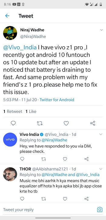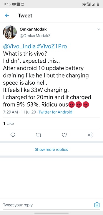 Some users of the Vivo Z1 Pro are also reporting inferior fast-charging speeds after the update. Here are just a few of the reports that we came across.
