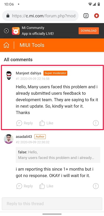 In response to this user-complaint, a Super Moderator on the Mi Community Forum confirms that this issue has been submitted to the development team. He goes on to confirm that the bug is set to get fixed in an upcoming update, most probably MIUI 12 for Redmi Note 9S.