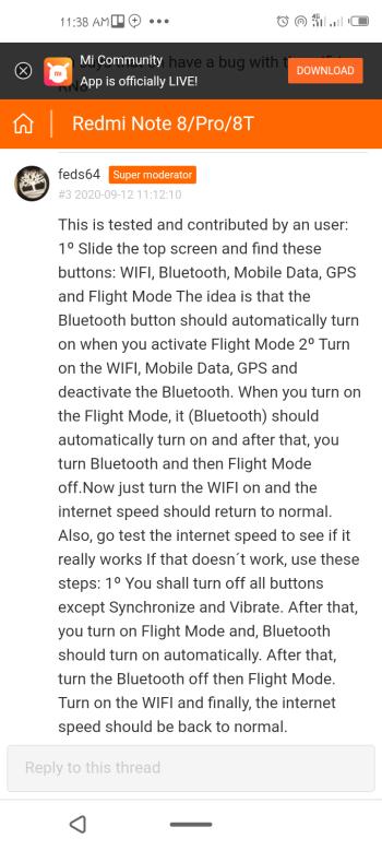2. Turn on the Redmi Note 8 WI-FI, Mobile Data, GPS, and deactivate the Bluetooth. When you turn on the Flight Mode, it (Bluetooth) should automatically turn on and after that, you turn Bluetooth and then Flight Mode off. Now just turn the WI-FI on and the internet speed should return to normal. Also, go test the internet speed to see if it really works!If that doesn´t work, use these steps: