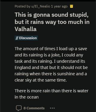 Below are some reports from AC Valhalla players who are tired of the in-game world raining issue whenever they load a save game.