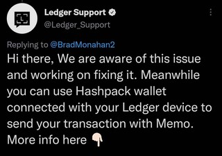 @Ledger_Support I emailed a concern. When sending HBAR out of the ledger device you don’t provide an option for a destination tag, this results in lost coins if sent to