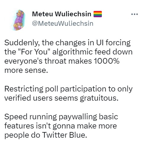 Well this might kill twitter for me. The vast majority of people I read on For You are not verified. Im not at the threshold that paying for $7 has value but this might just remove the value I do have