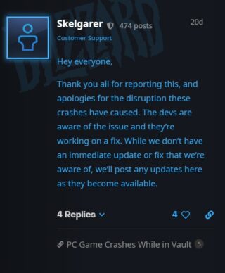 Interestingly, a player alleges to be experiencing such crashes whenever vault’s contents are being loaded into the memory while another game is being updated by the launcher in the background.