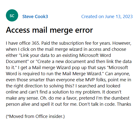 According to reports, users are met with error messages when they attempt to use the Word Mail Merge Wizard in the most recent version of MS Access/Office (version 2305).