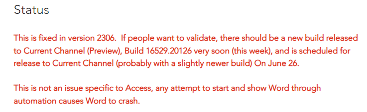 Fortunately, the issue where Microsoft Access users are running into ‘Word is required to run Mail Merge Wizard’ error message has been acknowledged by the team.