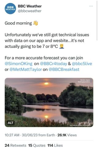 According to the support team on Twitter, BBC recommends tuning in to specific radio shows and TV programs for more accurate forecasts during this period of technical difficulty.