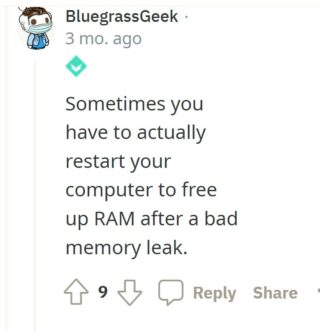 I got a notification my machine was running low on RAM. This memory bloat seems to happen over a day or two, regardless of what I’m doing. I think it started a month or two ago. Anyone else noticing this?