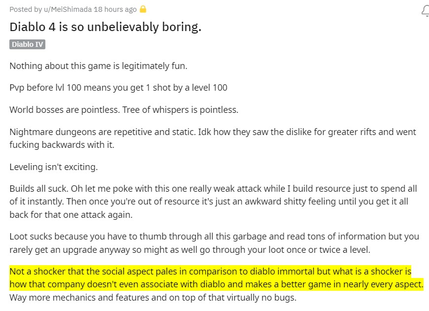 A gamer complains that even though Town, Legion, Helltide, and World Boss events are filled with many players, the rest of the game feels incomplete.