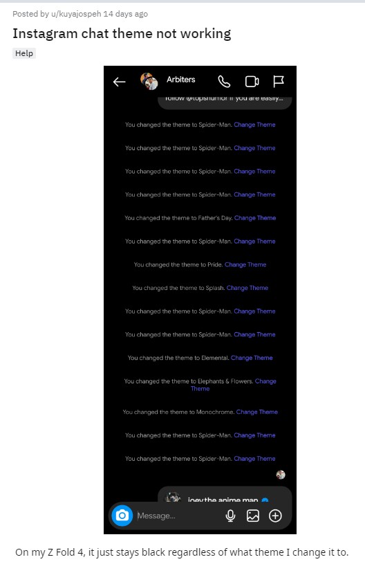 A Redditor claims to be experiencing this glitch ever since they transitioned from Direct to Messages. Even though they are able to reply and react to chats, they cannot see or change chat themes.