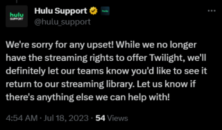 Hulu support has confirmed that the removal of ‘The Twilight Saga’ from their platform is due to the expiration of the streaming rights.