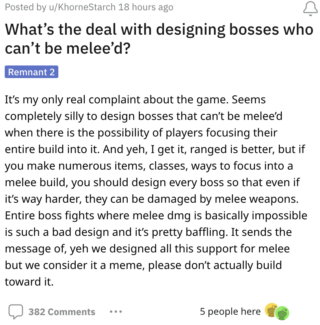 Melee builds seriously need some love in this game. I can’t believe how useless I feel when I can’t even get close to some of these bosses. Devs, please fix this!(Source)