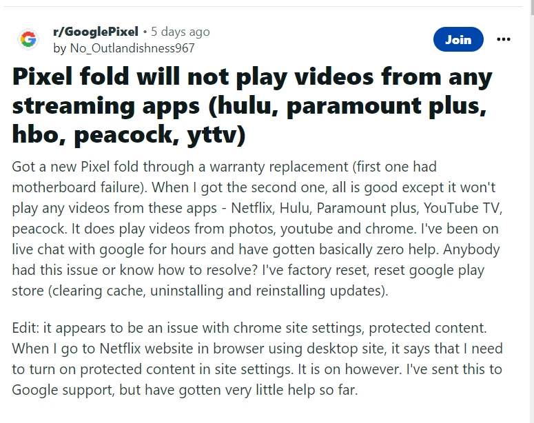 I had a pixel fold shipped on the first day available, that phone worked with streaming content. Motherboard failed, and got replacement device. Replacement device will not stream any apps (have tried Paramount plus, peacock, Hulu, yttv, Netflix).
