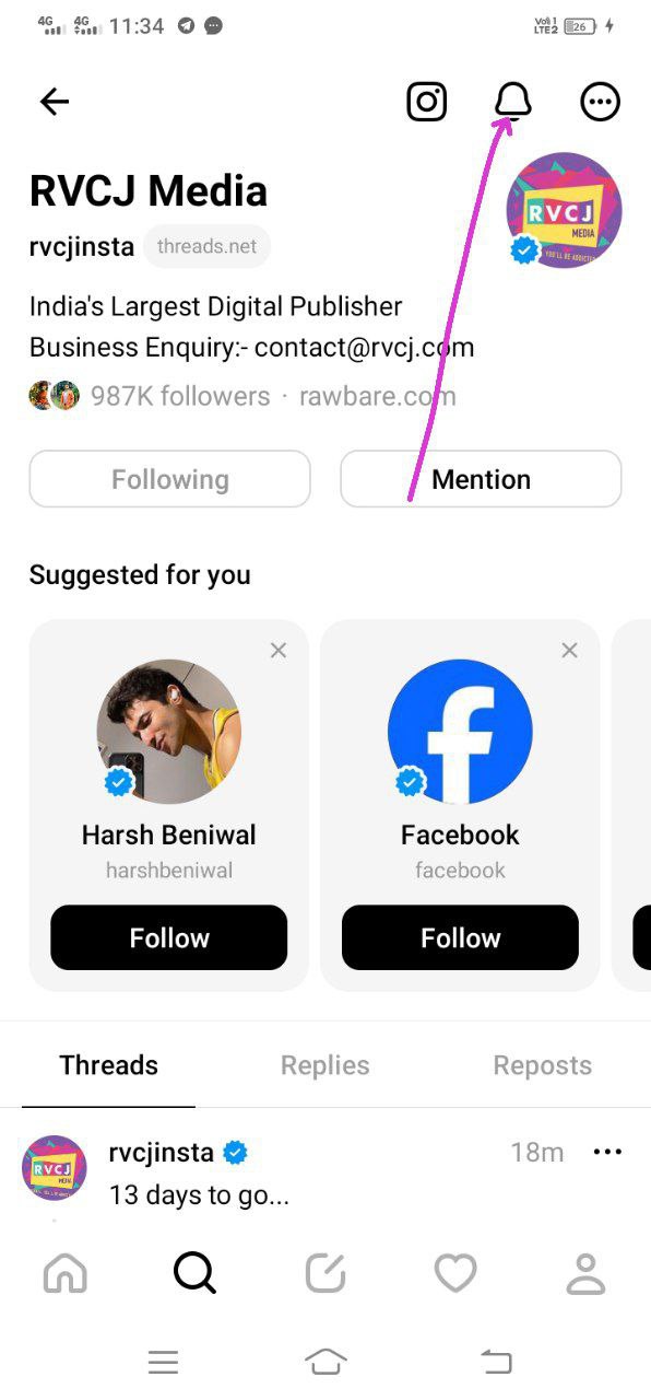• Once you hit the ‘Follow’ button, a bell icon will appear in the top-right corner. Simply tap on the bell icon to activate notifications for the account you’ve just followed.