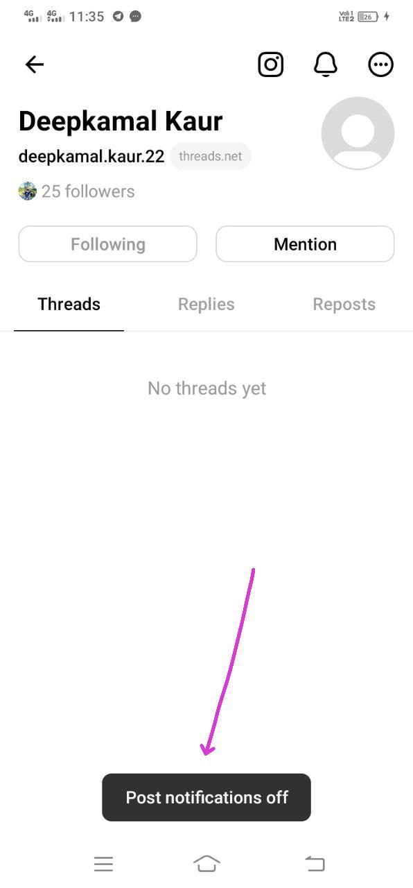 • You won’t see a pop-up to follow the account. Instead you’ll see a prompt message of confirmation from Threads i.e ‘You’ll get notifications when they post’.
