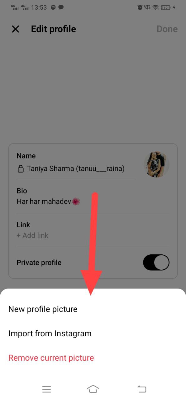 - Afterward, select your profile picture and pick from three available options: ‘New profile picture,’ ‘Import from Instagram,’ or ‘Remove current picture.’