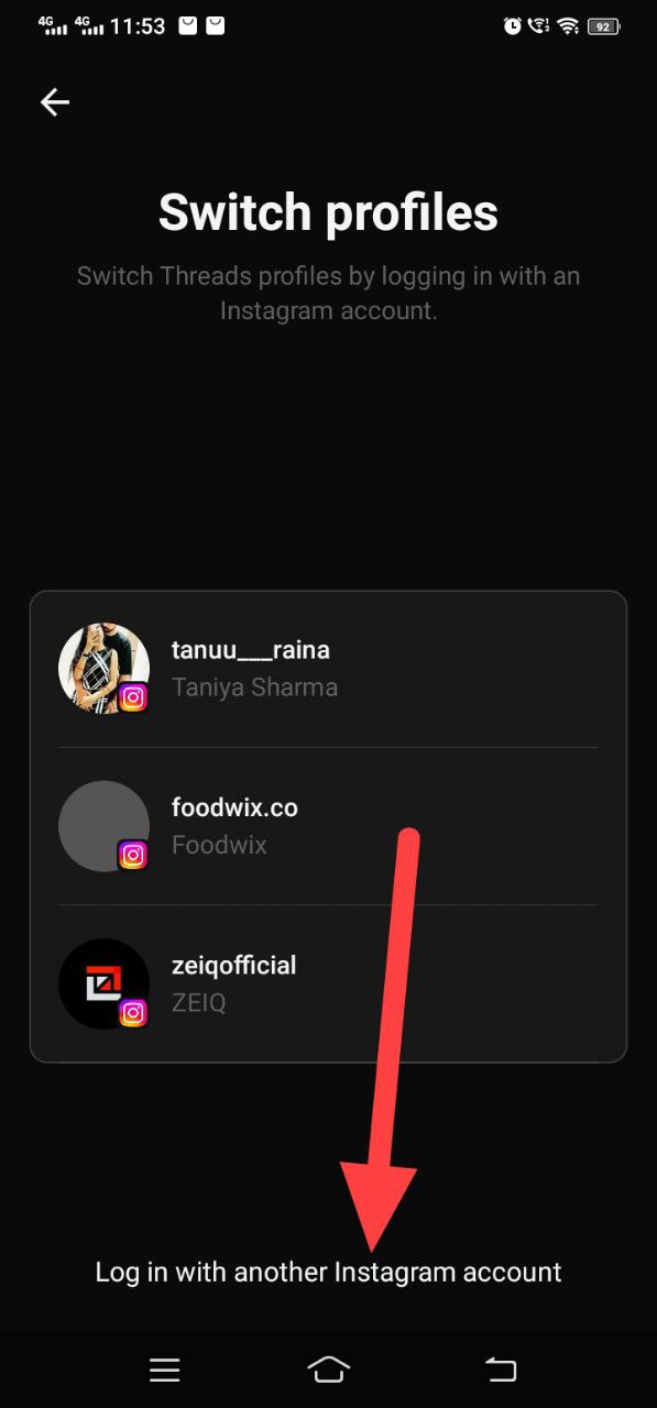 - Then tap on ‘Log in with another Instagram account’ and provide your desired Instagram account username and password to switch to that account on Threads.