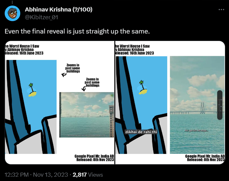 AK took to X (formerly Twitter) to express his concerns. He claimed that the similarities between the two videos extend beyond the mere use of a similar plot. According to his tweets, the shot composition, storyboard, and even the expressions of the characters as they attempt to find the sea view are strikingly identical. AK asserts, “It flows exactly the same way that my story flows. Even the final reveal, the last zoom-in to the sea, is executed in the same manner.”