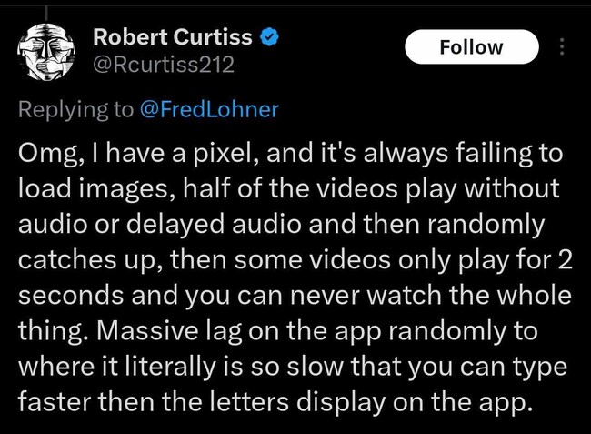 Among the several responses, the most mentioned X (Twitter) app issues on Google Pixel devices appear to be images not loading or loading slow, some videos playing with audio delay, or general lag throughout the app.