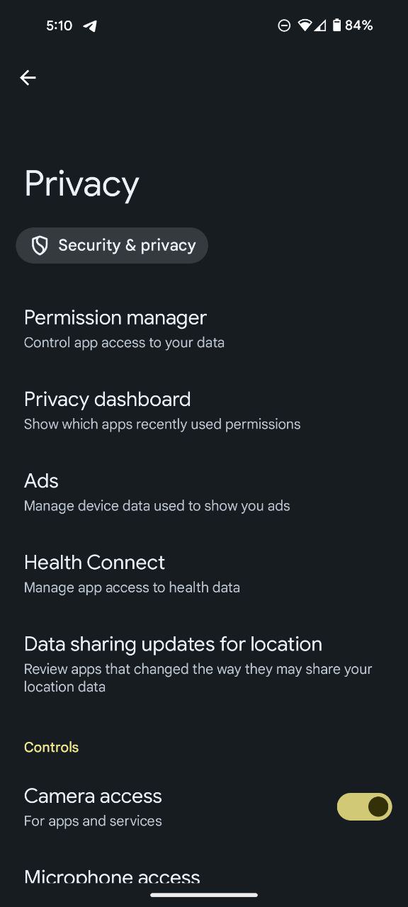 - If a camera-centric app has overstayed its welcome, tap on Privacy controls from the Security & privacy page and disable Camera access.