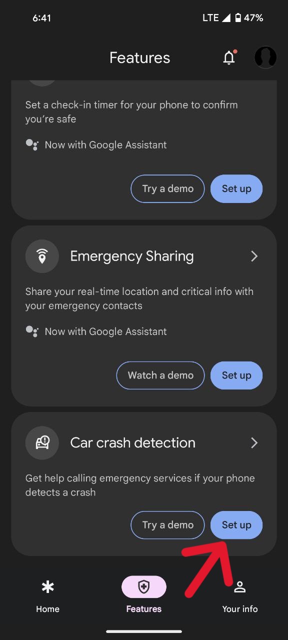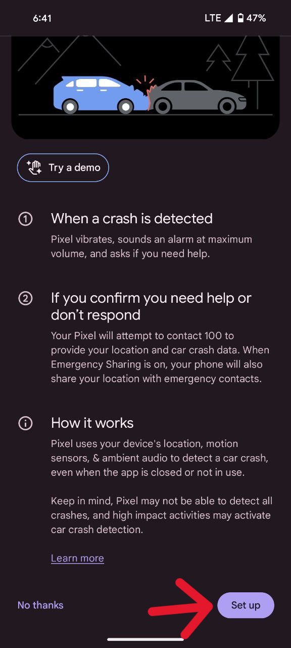 - Scroll through the features until you find the ‘Car crash detection’ option and press the ‘Set up’ button.
