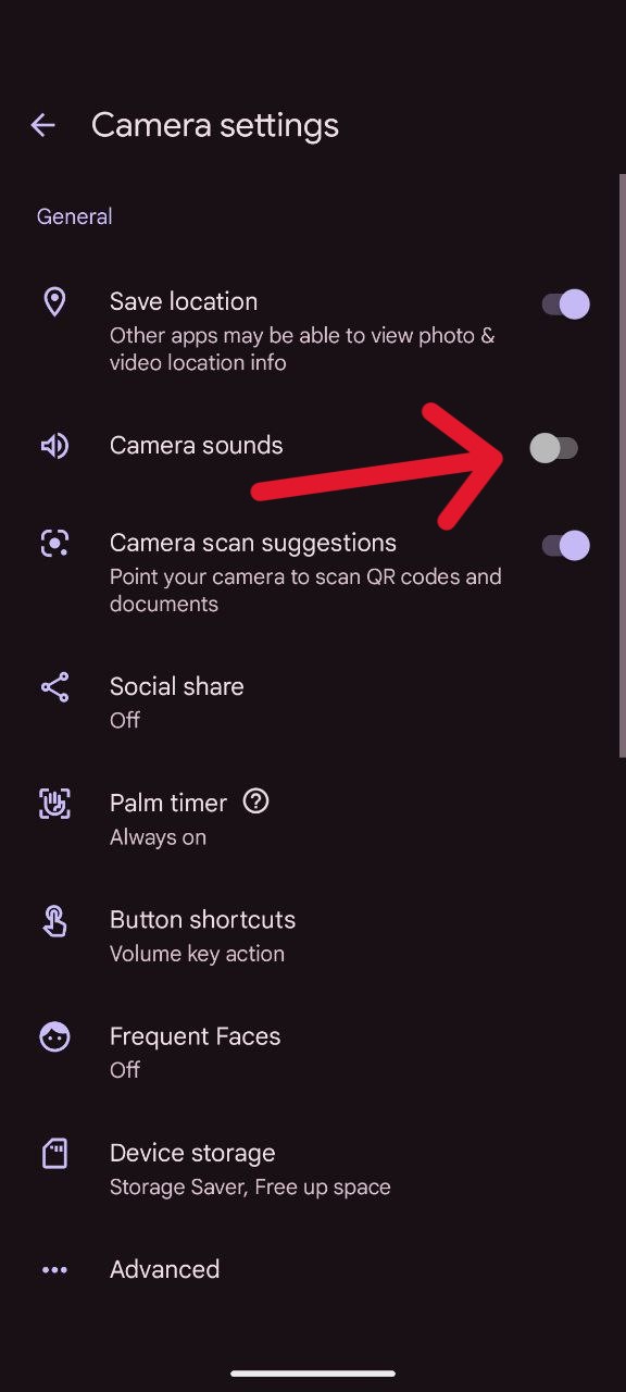 - Under General settings, locate and toggle off the switch for Camera sounds.