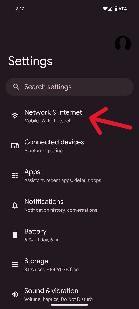 - Within the Settings, tap on ‘Network and internet’ to explore connectivity options.