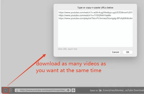 - For YouTube video download in bulk, click the ➕ on the left to batch-paste all the video URLs in the pop-up window. Notice that one URL each line, so press Ctrl+Enter on the keyboard to start a new line.