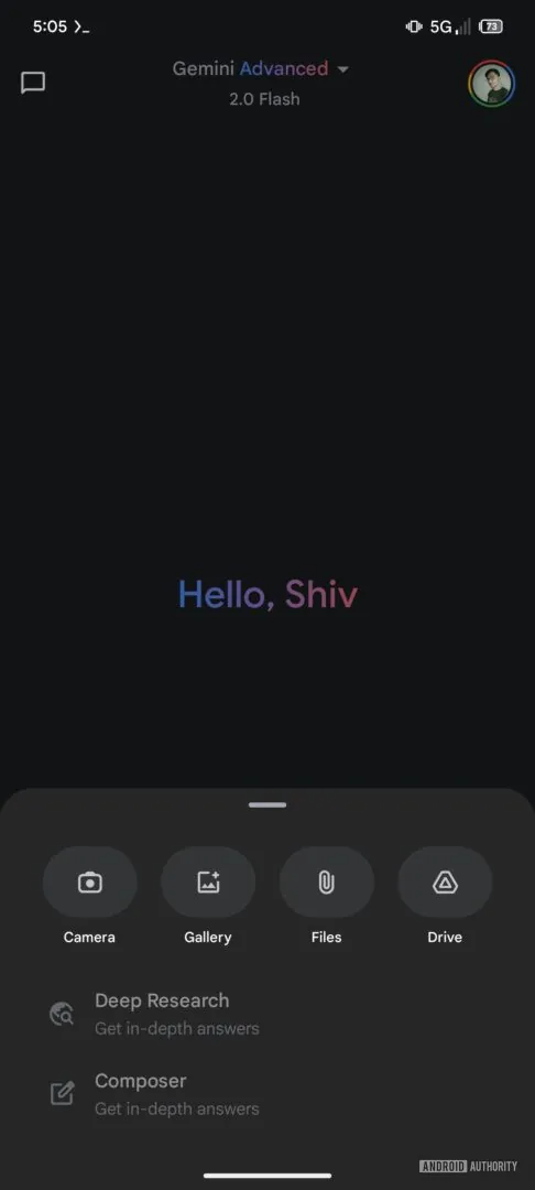 The updated layout features four buttons at the top for camera access, gallery selection, on-device files, and Google Drive uploads. Below that, the Deep Research tool (already available on Android) and the mysterious Composer option — described as a tool to “Write docs and Code” — are waiting in the wings.