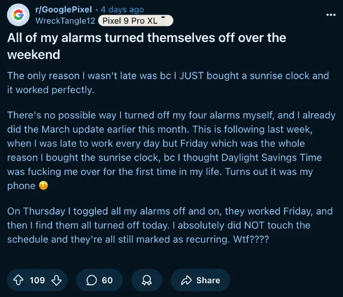 One user, WreckTangle12, posted, “All of my alarms turned themselves off over the weekend. There’s no possible way I turned off my four alarms myself.” Another, 3OneThird, chimed in, “My initial assumption was that I told Gemini to stop a timer that was going off and it cancelled all my alarms.” It’s a mess, and it’s mostly hitting Pixel 9 owners, though some folks with older models are grumbling too.