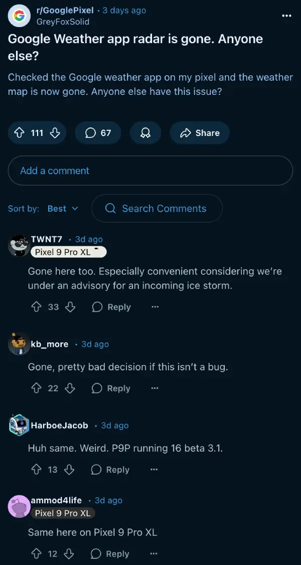 The reaction online has been one of confusion and frustration. On Reddit, user GreyFoxSolid kicked off a discussion asking, “Google Weather app radar is gone. Anyone else?” The responses quickly confirmed it wasn’t an isolated issue. User TWNT7 highlighted the poor timing, commenting, “Gone here too. Especially convenient considering we’re under an advisory for an incoming ice storm.” Another user, kb_more, expressed a common sentiment: “Gone, pretty bad decision if this isn’t a bug.” For some, it was a frequently used tool, with freeskatt asking, “Why’d they remove it? It’s the most convenient thing that i use everyday”.