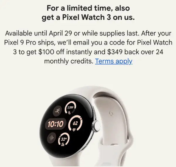 But the deal doesn’t stop with just the phone. After your Pixel 9 Pro ships, Google Fi will send you a special code via email for the Pixel Watch 3. Using this code gets you $100 off the watch instantly. The rest of the watch’s price, $349, will also be credited back to your bill over 24 months. It’s a structured way to reduce the upfront cost of both devices and save over time.