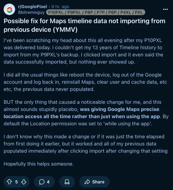 The trouble keeps stacking up. One cluster of posts focuses on maps timeline migration — setting up the Pixel 10 and realizing your old location history just won’t import, even following the steps provided. People moving from a previous Pixel are finding themselves stuck, uncertain if their years of travel logs, favorite routes, and past memories are gone for good.