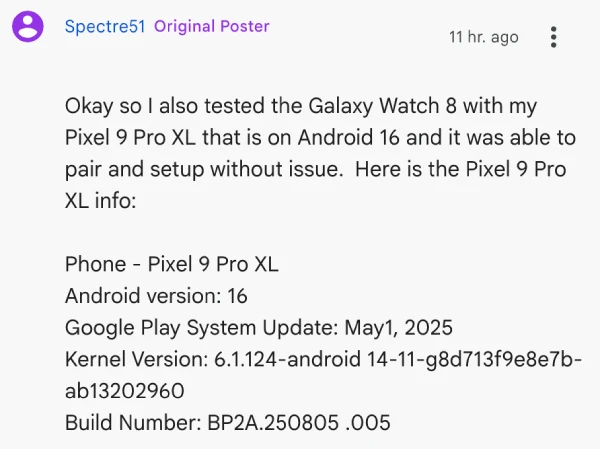 Interestingly, the same Galaxy watches that fail with Pixel 10 devices continue working normally when paired with Pixel 9 series phones, suggesting the issue stems from Android 16 or specific changes Google implemented in their latest hardware release. One user confirmed this by successfully pairing their Galaxy Watch 8 with a Pixel 9 Pro XL running Android 16. So it’s possible that a software bug specifc to the Pixel 10 series is causing the issue.