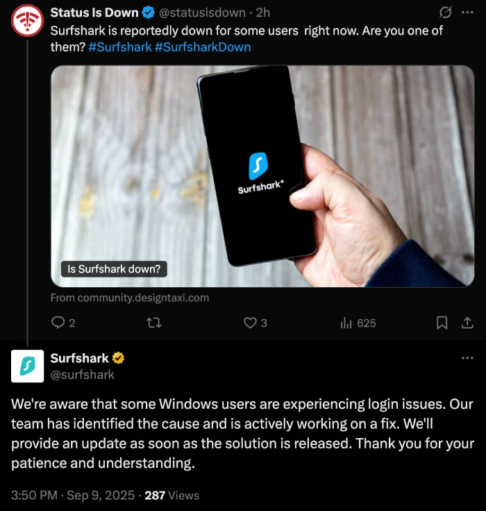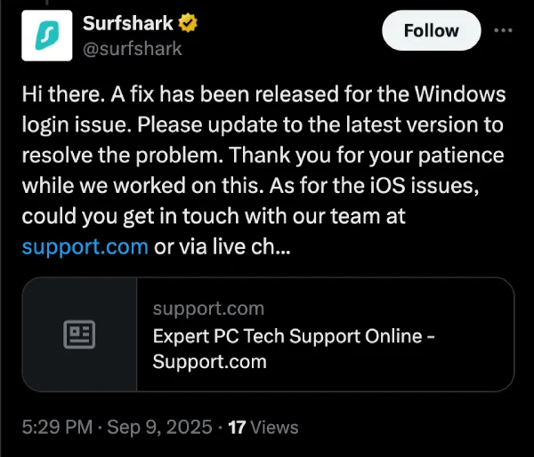 Surfshark acknowledged the issue on X around midday, saying that “We’re aware that some Windows users are experiencing login issues. Our team has identified the cause and is actively working on a fix.”
