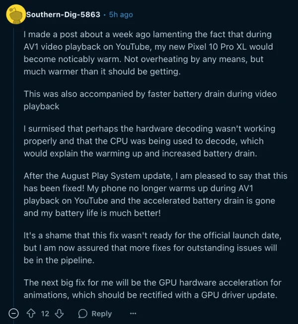 Some Pixel users are reporting interesting side effects from the update. While the usual jokes about improved battery life are making their rounds on Reddit (with one user claiming 17-day battery life), there are legitimate reports of AV1 video playback improvements on YouTube. A Pixel 10 Pro XL owner mentioned that their device no longer heats up during video playback and battery drain during streaming has improved noticeably.