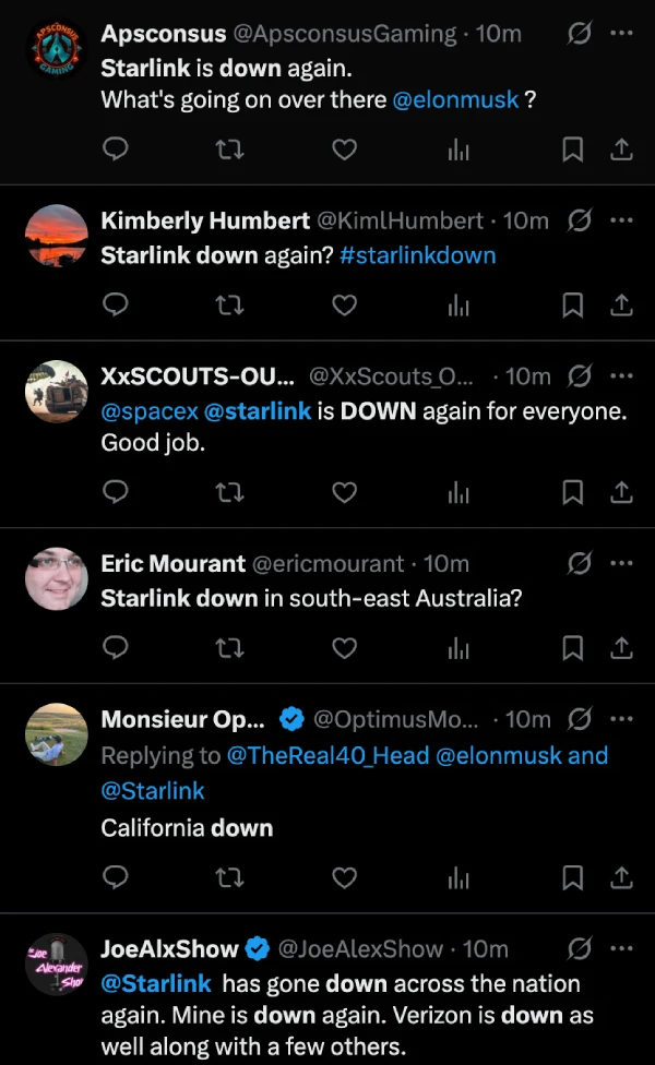 No word yet from SpaceX or Starlink’s official channels about what’s causing the problem or when service might return. Users will likely have to wait it out and hope their connections come back online soon.