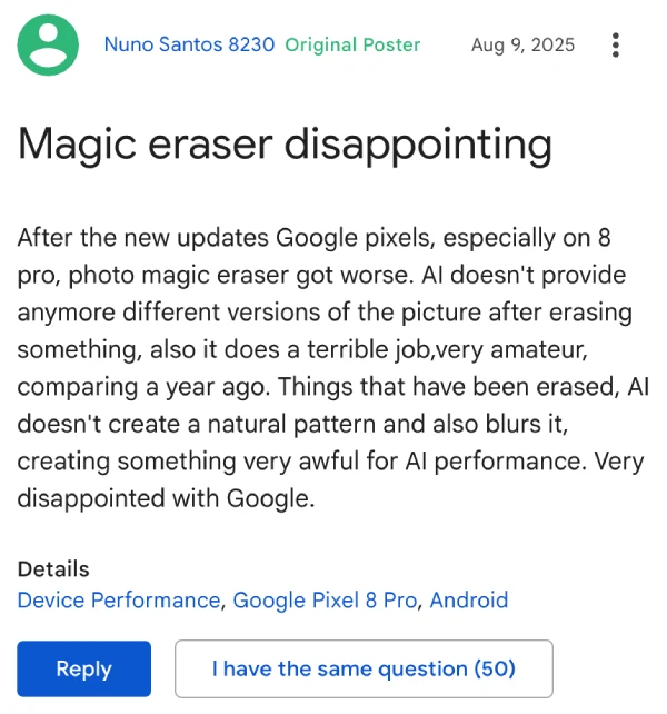 On Google’s Pixel community, one Pixel 8 Pro owner said results look worse than a year ago, with no alternate “versions” after an erase and fill patterns that blur or look unnatural.