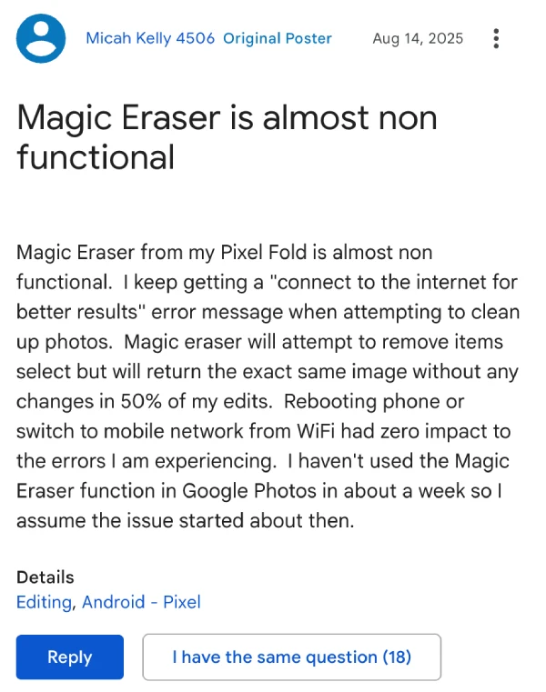 Some of the frustration traces back to editor changes this summer, with users saying the original Magic Eraser behavior was replaced or altered as Magic Editor access shifted, leaving the current eraser feeling limited or inconsistent on device. A separate wave of posts complains that the tool is simply slower than before, which only makes the misses feel worse.
