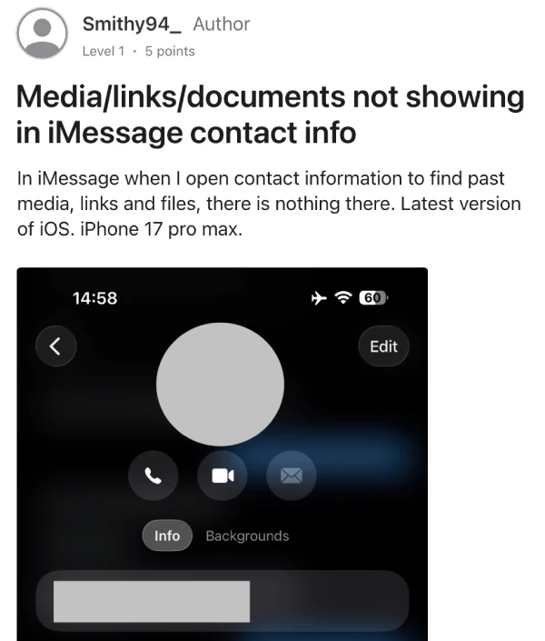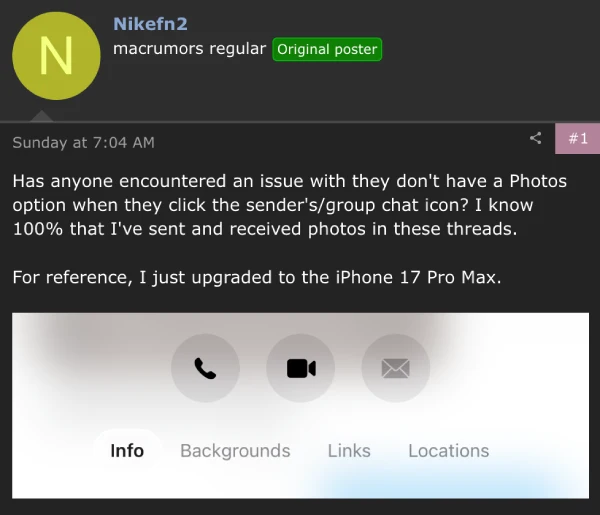 The scope of the problem extends beyond just photos. MacRumors forum user Nikefn2 reported that their iPhone 17 Pro Max was completely missing the Photos option when tapping on contact names in message threads, despite knowing “100%” they had exchanged photos in those conversations.