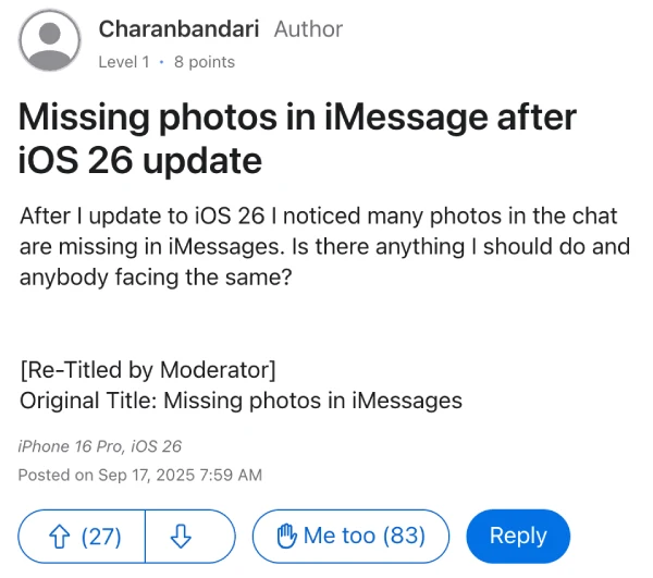 “After I update to iOS 26 I noticed many photos in the chat are missing in iMessages,” Charanbandari explained in their original post, which has since attracted 83 “Me too” responses from other affected users.