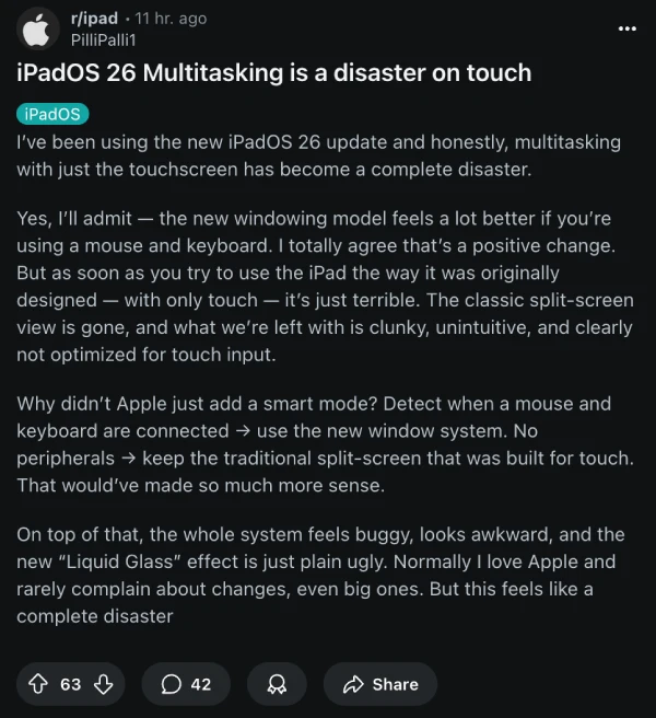 Not everyone hates the changes. fernsie defended the update: “I use touch and I love the new system.” Similarly, Locked-in-red found the transition smooth: “I mean it works fine for me using touch. I’m having no issues at all on my 11 inch iPad Air.” But these positive voices are notably outnumbered by criticism across Reddit, Apple’s forums, and X.