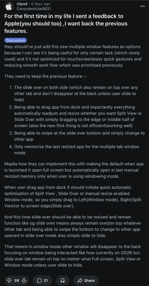 The popular slide-over feature, which allowed small app windows to float over full-screen content, has vanished entirely. ConsistentUse5631, who sent their first-ever feedback to Apple over this issue, lamented losing “the slide over on both side (which also remain on top over any other tab and don’t disappear at the back unless user slide to hide).”