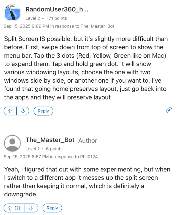 The main thing with the update is that the new system works reasonably well with a keyboard and mouse attached. PilliPalli1 acknowledged this divide: “Yes, I’ll admit — the new windowing model feels a lot better if you’re using a mouse and keyboard. I totally agree that’s a positive change. But as soon as you try to use the iPad the way it was originally designed — with only touch — it’s just terrible.” The solution they proposed seems obvious in hindsight: “Why didn’t Apple just add a smart mode? Detect when a mouse and keyboard are connected → use the new window system. No peripherals → keep the traditional split-screen that was built for touch.”