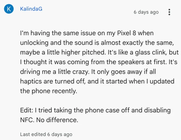 After listening to the audio, KalindaG commented, “I’m having the same issue on my Pixel 8 when unlocking and the sound is almost exactly the same, maybe a little higher pitched.”