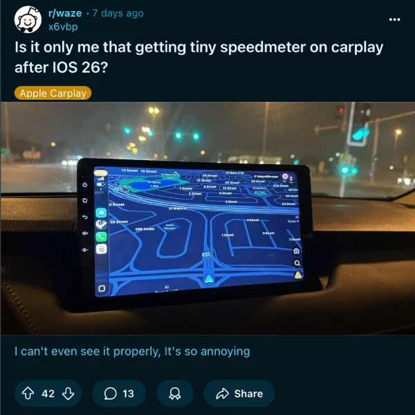 Others have chimed in to confirm the feature worked perfectly on the previous iOS version, pointing to the new update as the culprit. On top of that, other users have noticed that the Waze user interface elements, like the speedometer, now appear much smaller than before, making them difficult to see at a glance while driving.