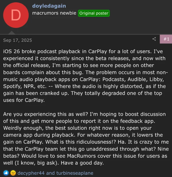 That MacRumors thread also notes the distortion has been present since the betas and slipped through to release, and the poster asked others to file feedback to raise the priority, given that podcasts and audiobooks are a primary use of CarPlay for many drivers. It is a clean reproduction case that should be actionable for engineering, which often means relief comes sooner rather than later once enough reports converge on the same signature.
