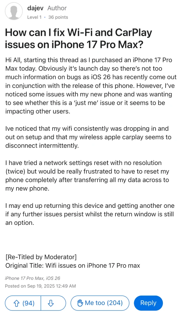 It starts with posts like dajev describing Wi‑Fi cutting in and out during setup and CarPlay disconnecting intermittently on day one, which set the tone for a thread full of similar experiences from early adopters who expected smooth sailing but got constant nagging prompts and inconsistent links instead. Several replies point out that the older phone on the same network behaved fine, which complicates the “it’s just the router” explanation and puts the spotlight back on iPhone 17 hardware or iOS 26 changes.