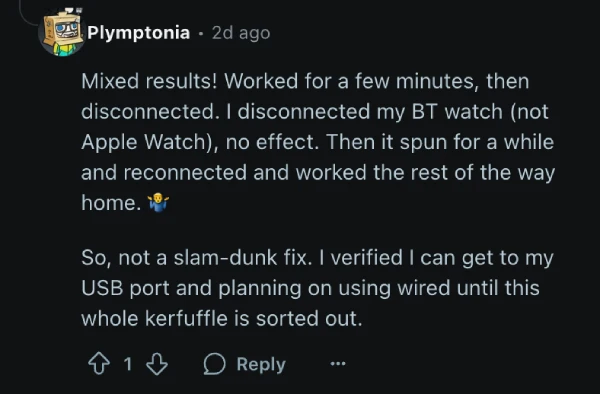 Once in the car, the pattern many describe is a clean initial connection that collapses a few minutes later, sometimes taking the head unit with it and forcing a full shutdown of the vehicle before CarPlay will reappear. As offdwall put it, wireless CarPlay “works for about 5–10 min… then the car head unit locks up,” while wired USB reportedly works without drama. So that could be a temporary workaround for those affected.