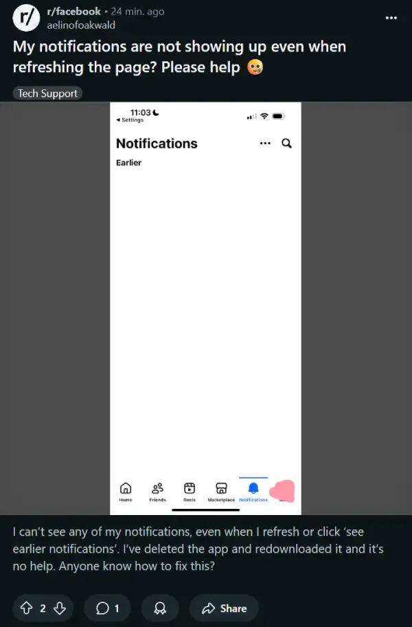 Others, like the OP on Facebook, are at least getting a somewhat helpful error message that reads “Notifications aren’t available at the moment.” It’s a small consolation, but at least those users know the platform acknowledges something’s wrong rather than just staring at empty space.