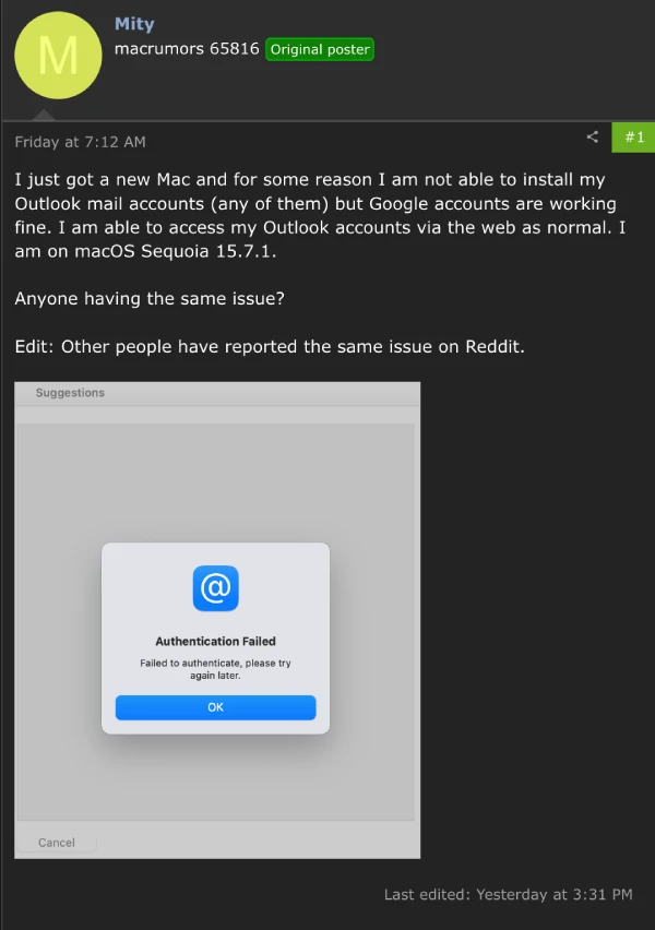 One person noted that their iPhone handles Outlook accounts just fine, but their Mac after the Tahoe 26.0.1 update throws errors. Some users also mentioned that Microsoft 365 Exchange accounts seem to work, but personal Outlook.com and Hotmail accounts are the ones causing headaches.